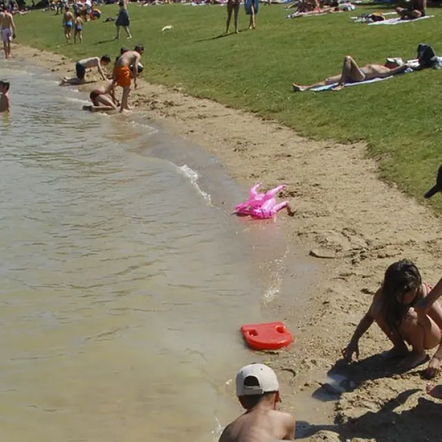 Enfants qui jouent dans l’eau dans la piscine de la Plaine Tonique à Malafretaz, au cœur de la Bresse, à proximité de Bourg-en-Bresse