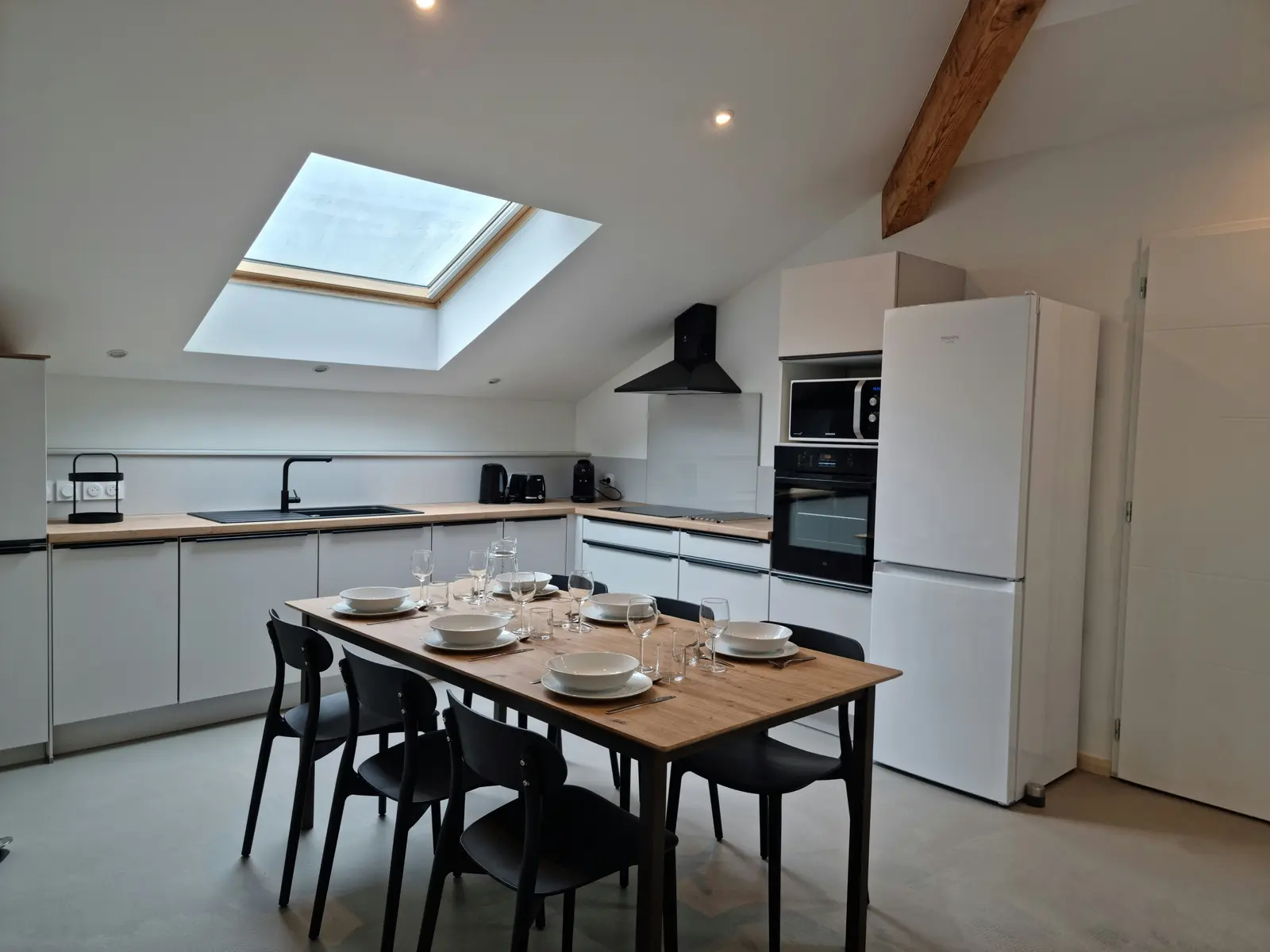 La cuisine est entièrement équipée : plaque induction, four électrique, micro-onde, frigo combiné congélateur, bouloir, grille-pain, cafetière l’Or Barista compatible capsule Nespresso…