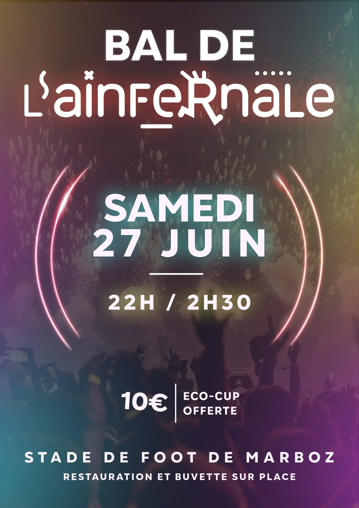L'Ainfernale 2026 propose son traditionnel Bal des Jeunes pour conclure sa journée sportive et musicale ! Rendez-vous le 27 juin de 22h à 2h30 pour prolonger la fête dans une ambiance conviviale et festive. Entrée : 10 € avec ecocup offert.
