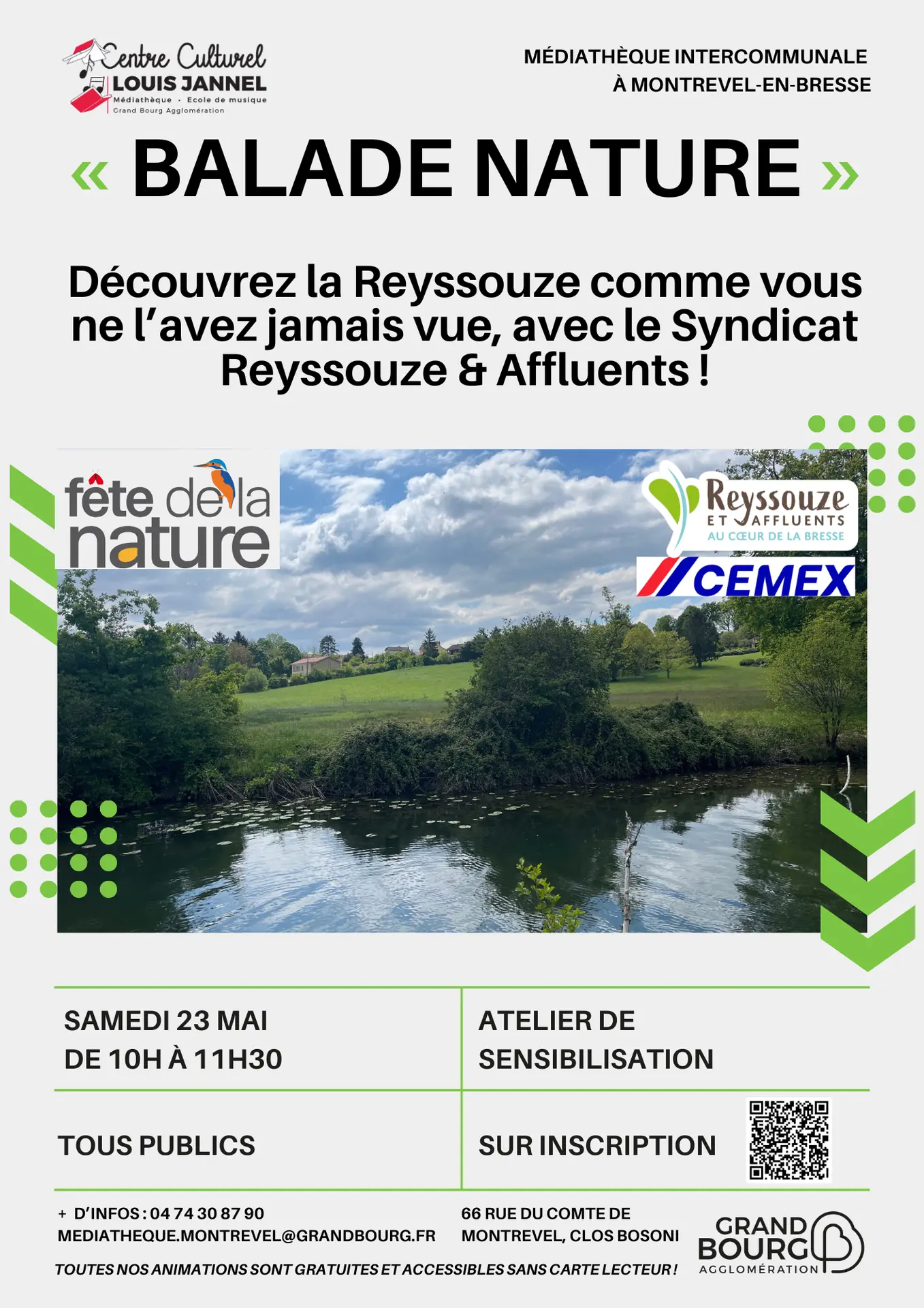 Le Syndicat Reyssouze & Affluents vous propose une balade nature et ludique au départ de la Médiathèque et jusqu’aux abords de la Reyssouze, afin de découvrir l’écosystème qui nous entoure. Dans le cadre de la Fête de la Nature.