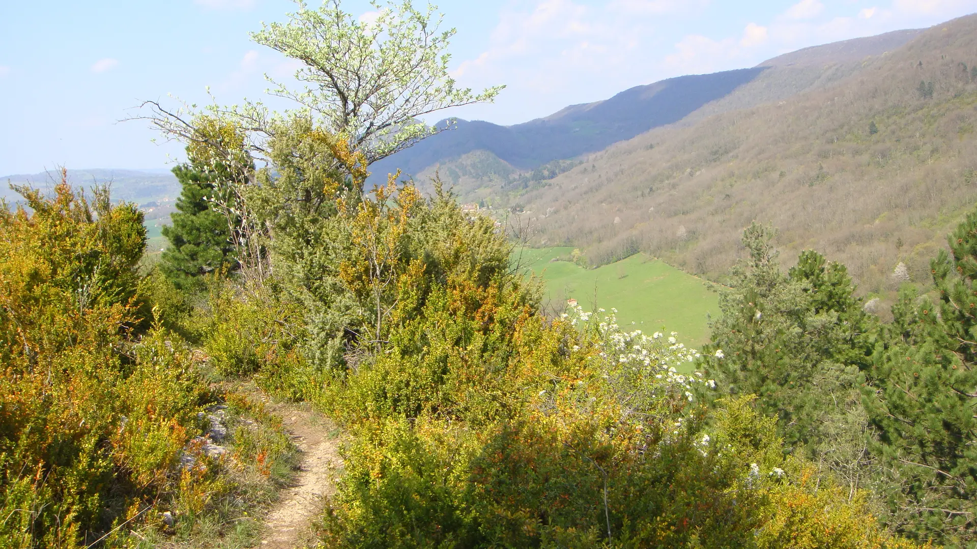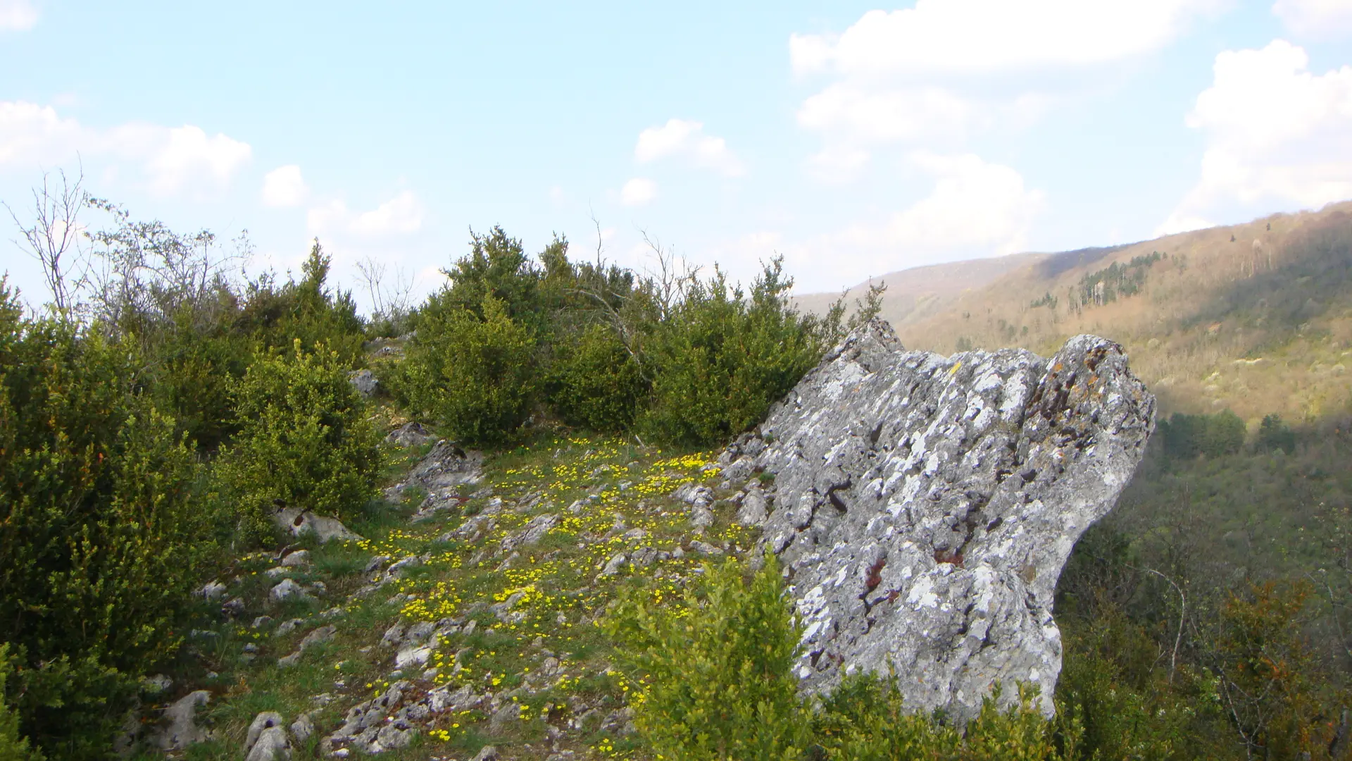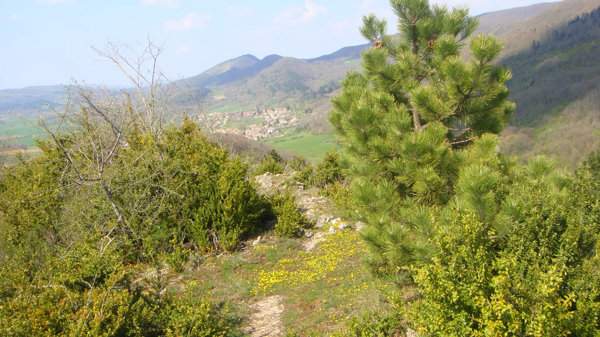 Montcel. Point de vue avant Treffort. Passage au dessus de la grotte de la Balmette (habitat préhistorique : silex, poterie, hache et ossements). Nombreux Murgers.