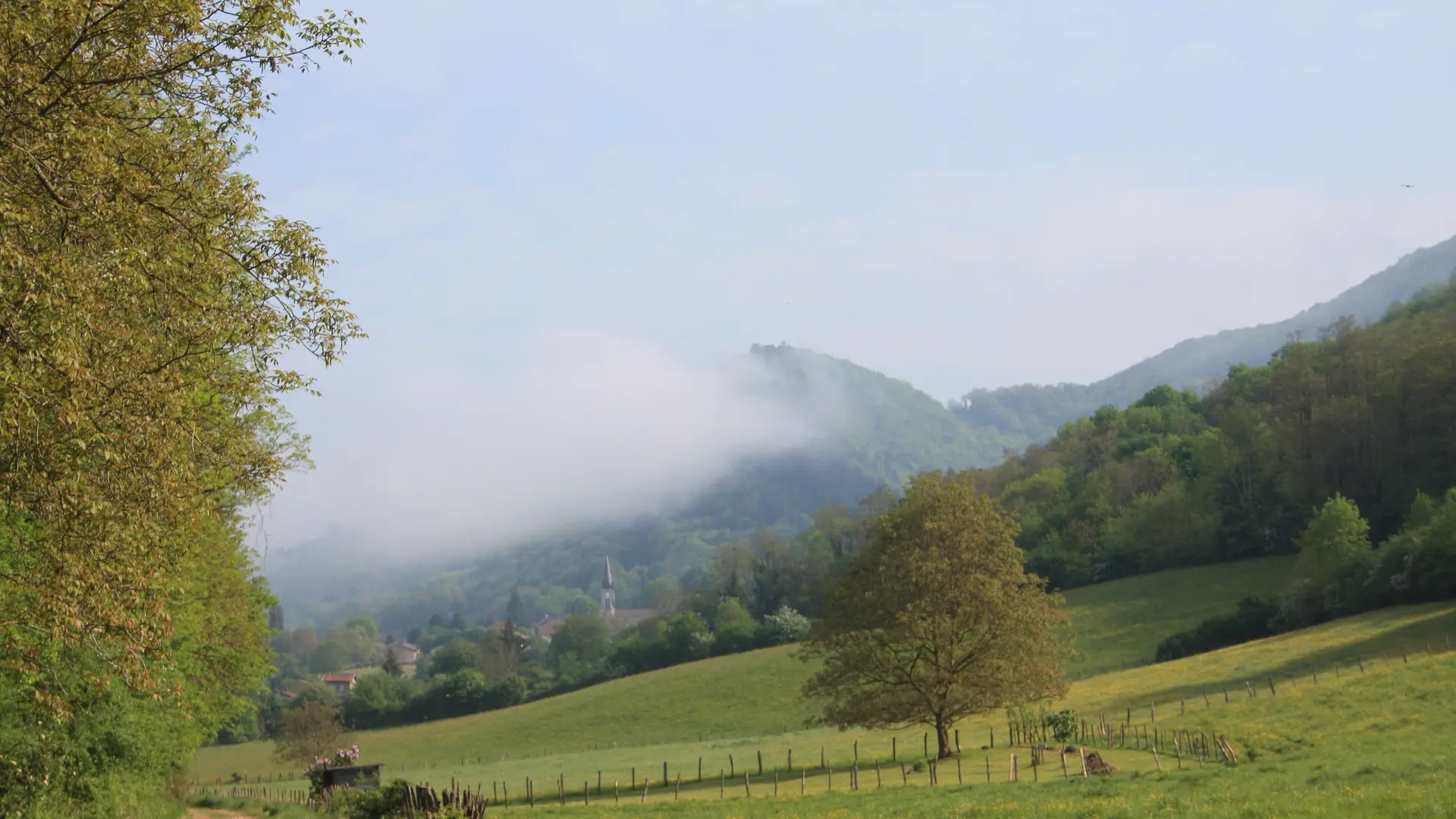 Parcours : Prendre le chemin direction Cuisiat. Sur les pentes de Montcel on aperçoit très nettement les Murgers, qui rappellent que cette colline était couverte de vigne avant la guerre. Retour sur Treffort derrière
