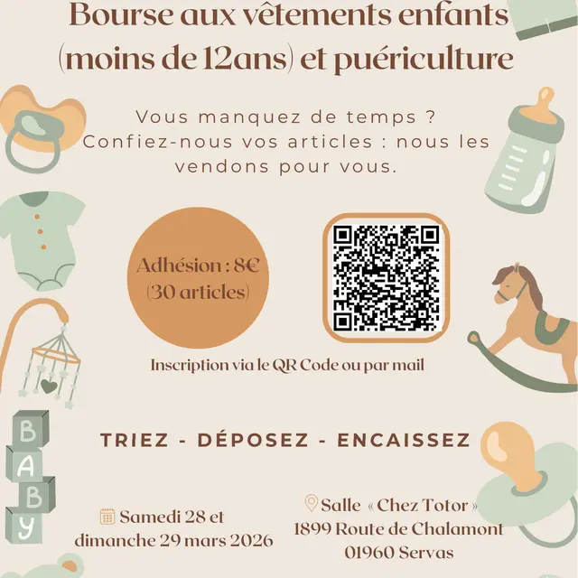 Donnez une seconde vie aux vêtements et articles de puériculture ! Bourse enfants (0-12 ans) les 28 & 29 mars à Servas. Nous vendons pour vous. Inscrivez-vous dès maintenant.