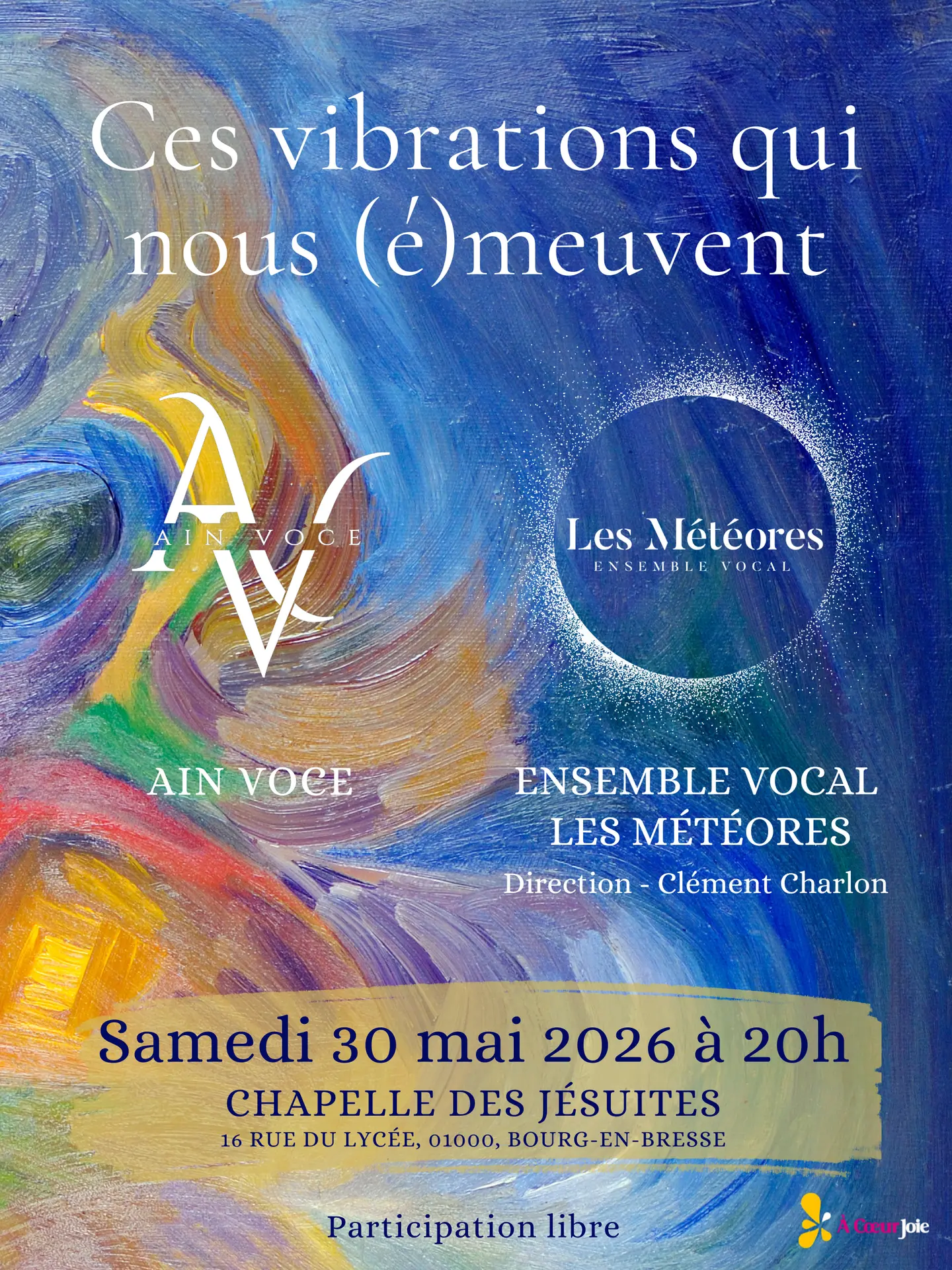 Concert partagé de Ain Voce, association de chanteurs et chanteuses Burgiens et de l'Ensemble Vocal Les Météores, ensemble féminin de chanteuses de la région Auvergne-Rhône-Alpes.