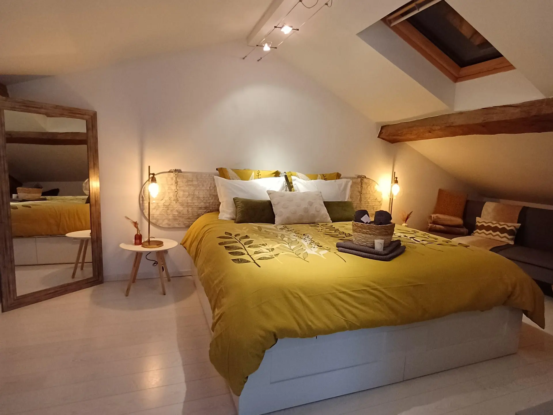 Le palier s'ouvre sur les deux chambres mansardées. Spacieuses, elles s'adaptent facilement à la configuration de votre groupe : pour 2 couples, vous apprécierez le confort des lits kings size et queen size, pour une famille avec enfant, chacun trouvera sa place, lits simples et lit double dans des espaces différenciés.
