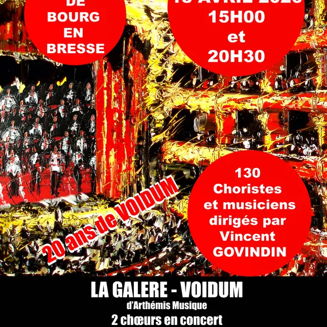 Pour son concert annuel les 2 choeurs d'Arthémis Musique, La Galère, Voidum, dirigés par Vincent GOVINDIN, présentent leur nouveau spectacle. Ils seront accompagnés de musiciens professionnels.