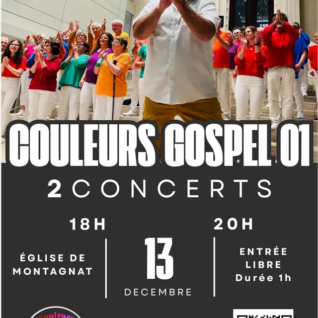Dans le cadre du Noël des associations de Montagnat, le chœur Couleurs Gospel 01 qui répète chaque semaine au sein du village,viendra clôturer cet événement avec non pas un concert, mais bien deux concerts le 13 décembre 2025 en l'église de Montagnat. L'un à 18h et l'autre à 20h.