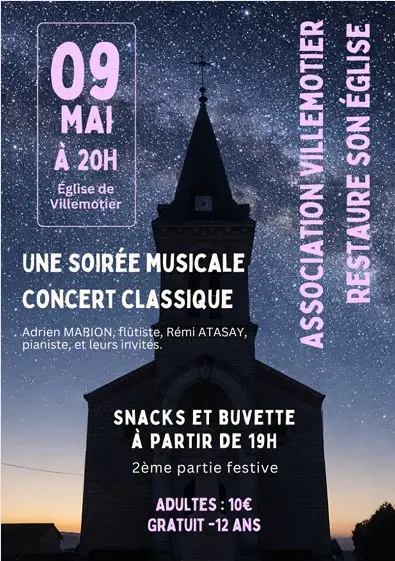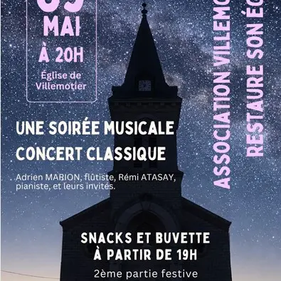 Concert de musique sacrée et classique dans l'église suivi d'une seconde partie plus populaire. Avec Adrien Marion flûtiste, Rémy Atasay pianiste et leurs invités