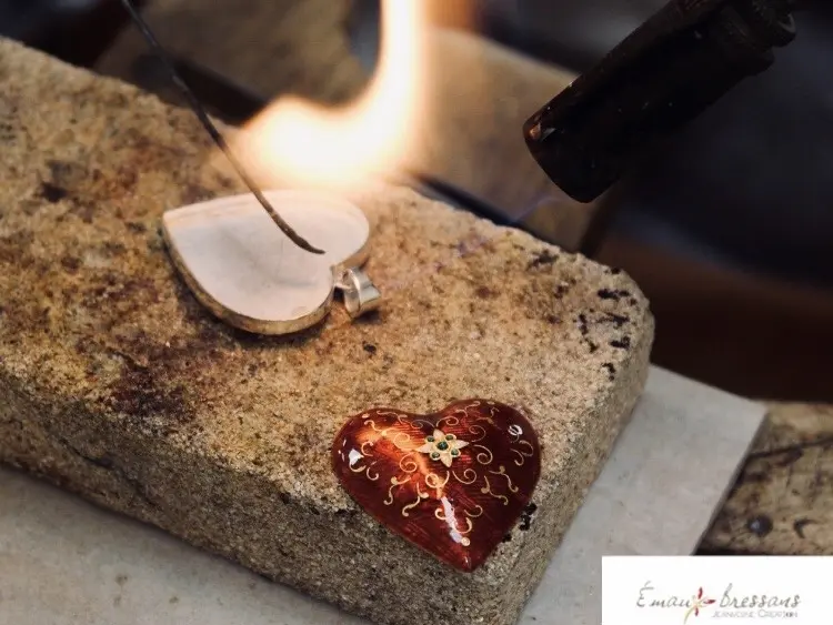 Les émaux bressans sont réalisés à la main sur fond d'argent découpé au marteau dans des plaques laminées. Ce fond présente un relief croisillonné retenant la couleur et est orné de paillons d'or. Plusieurs couleurs agrémentent les créations: bleus, orangés, verts, blanc... De nombreuses déclinaisons sont réalisées dans l'atelier au-dessus du magasin: bagues, boucles d'oreilles, bracelets, montres, pendentifs, et même bouchons de Champagne ou stylos, pour ne donner que quelques exemples.