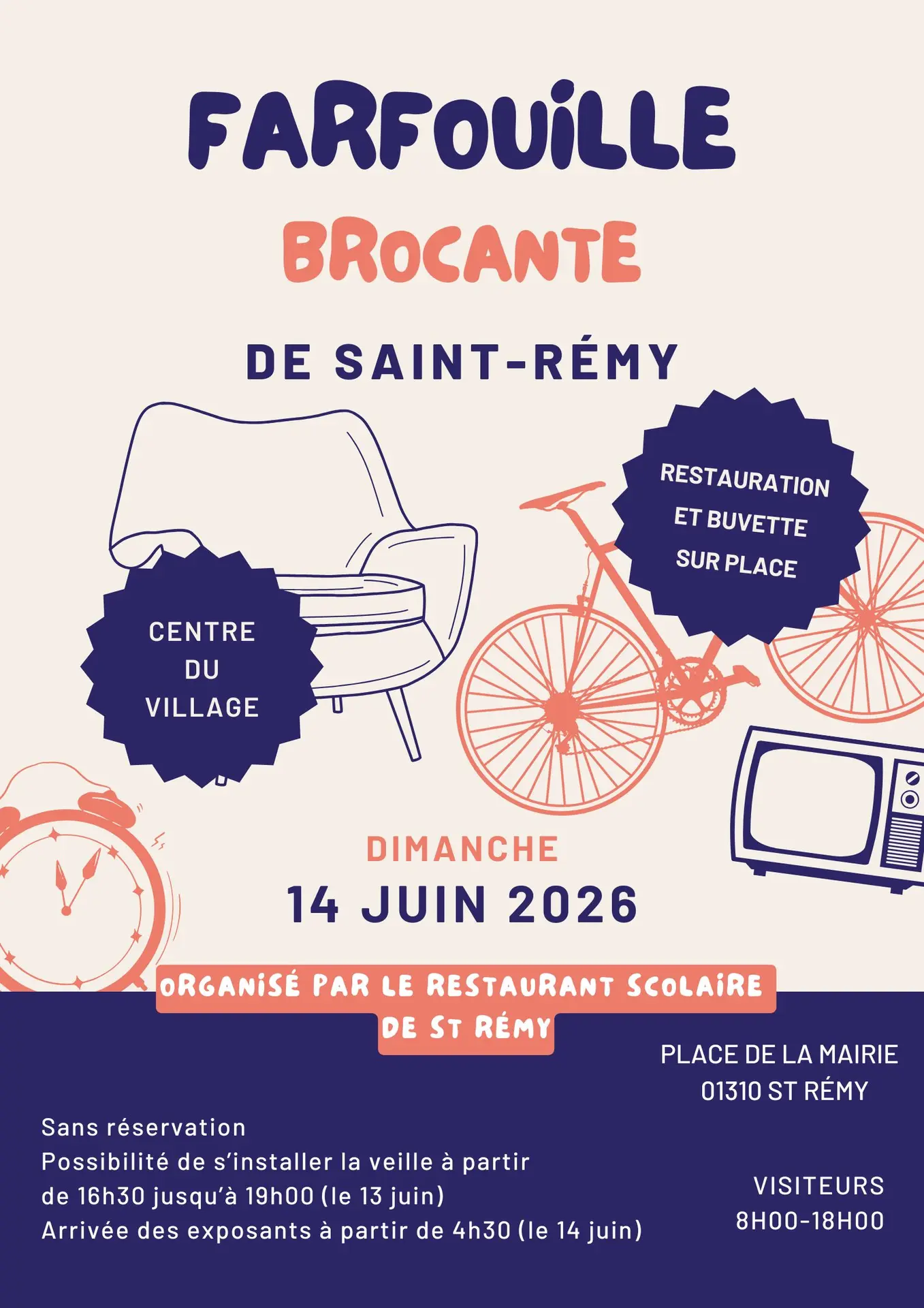 Farfouille / Brocante organisée par le restaurant scolaire de St Rémy. Possibilité de s'installer la veille (samedi 13/06/26) à partir de 16h30 jusqu'à 19h00. Arrivée des exposants le dimanche (14/06/26) à partir de 4h30. Restauration et buvette sur place