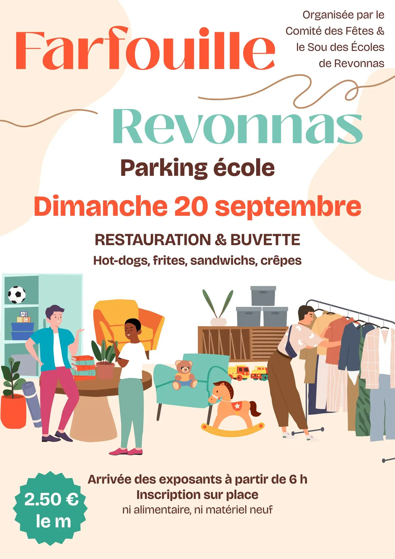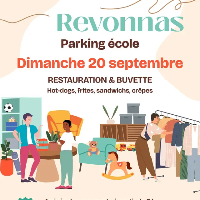 Farfouille de Revonnas. Organisée par le Comité des fêtes et le Sou des Écoles de Revonnas. Restauration et buvette (hot-dogs, frites, sandwichs, crêpes). Arrivée des exposants dès 6 h, inscription sur place. 2.50€ le mètre.