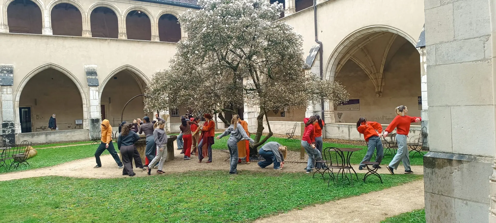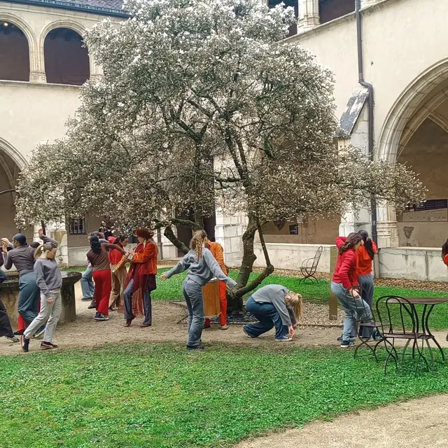 Promenade matinale au Monastère : Voix mêlées mêle les arts dans les cloître et l'église : Danse, musique instrumentale, chant, poésie de la poétesse Pauline Picot.