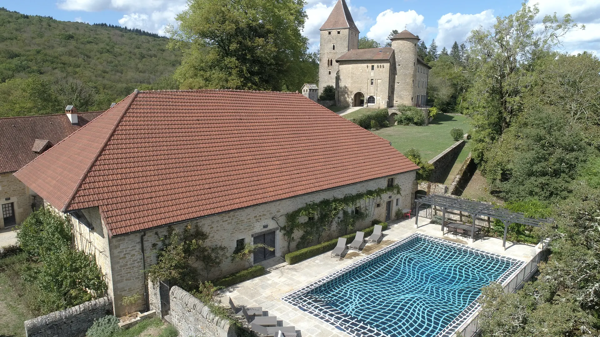 3 gîtes de groupe pour maximum 20 personnes, dans le domaine du château de Marigna sur Valouse en Petite Montagne du Jura. Hébergements haut de gamme, classés 4 épis par Gîtes de France, dans un parc naturel de 12 ha, avec piscine privative et tennis.