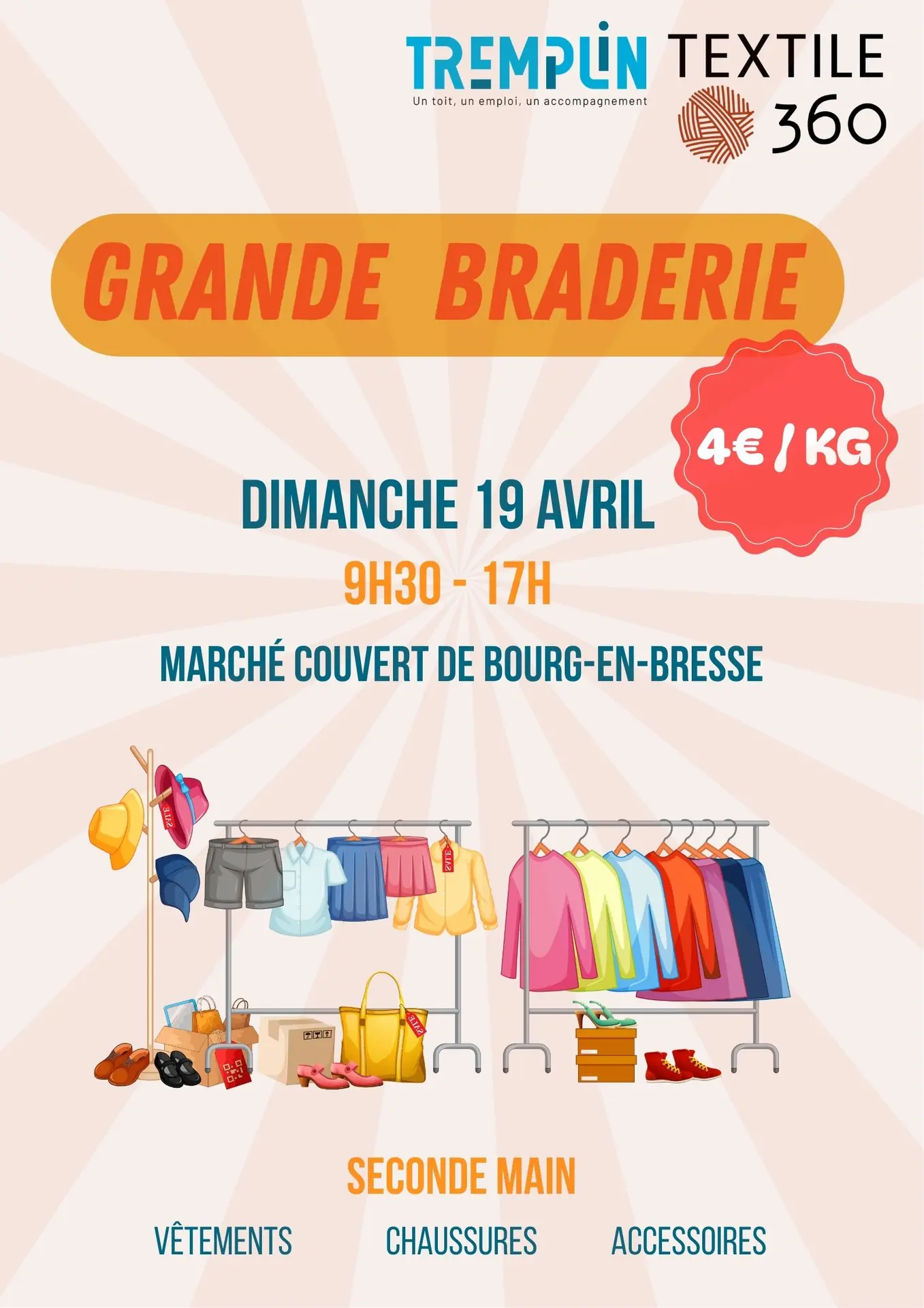 L'Association Tremplin organise dans le cadre de son projet textile 360 une grande braderie de vêtements, chaussures et accessoires de seconde main au prix unique de 4€ le kilo.