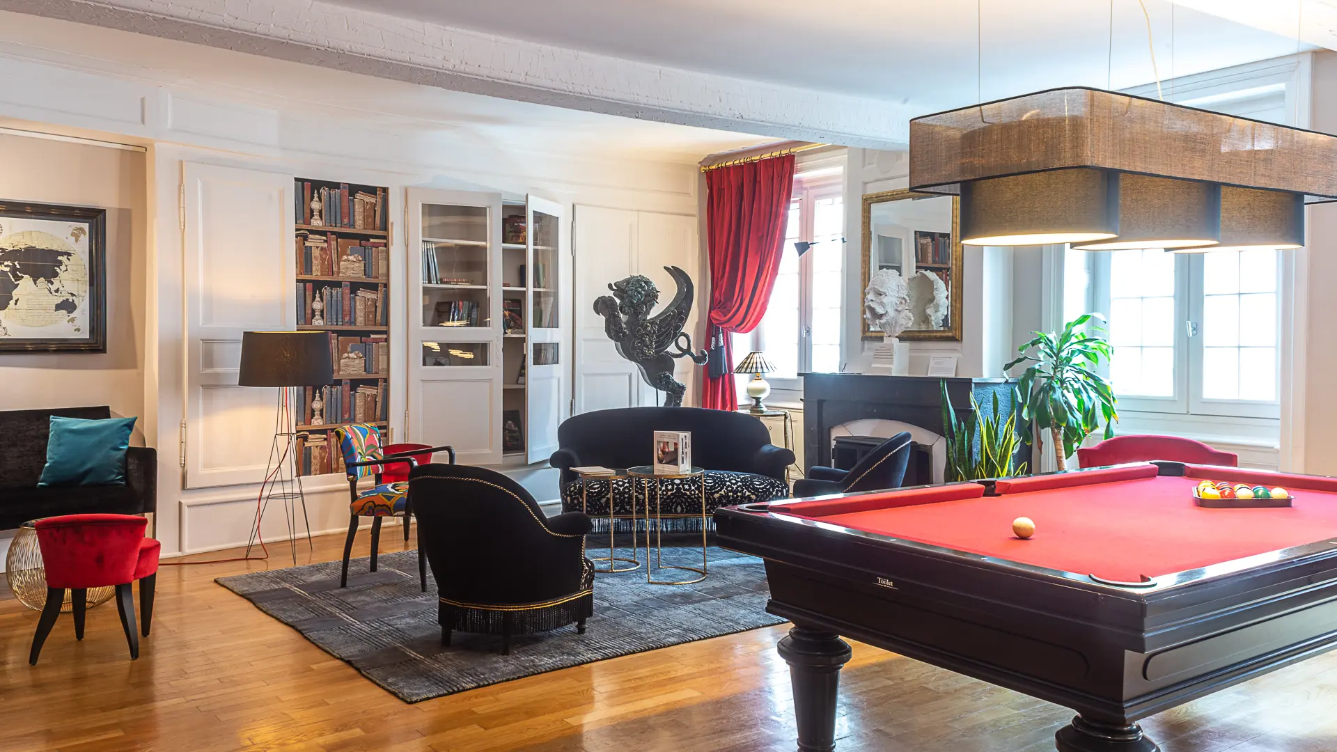 Univers soigné des 16 chambres aux ambiances toutes différentes et ses beaux espaces communs : salon détente avec billard, bar et terrasse dans la cour intérieure.
