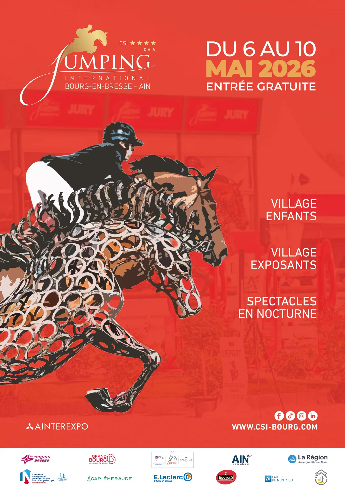 En 2026, le Jumping International de Bourg en Bresse - Ain fêtera ses 35 ans du 06 au 10 mai. Cet événement au rayonnement international sera encore ouvert à tous et gratuit pendant 5 jours mélangeant sport et de convivialité.