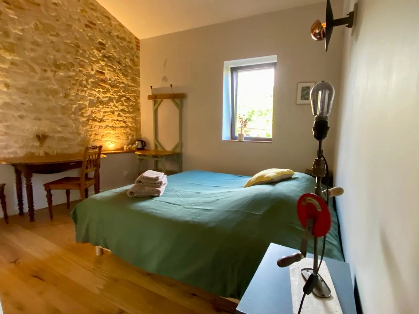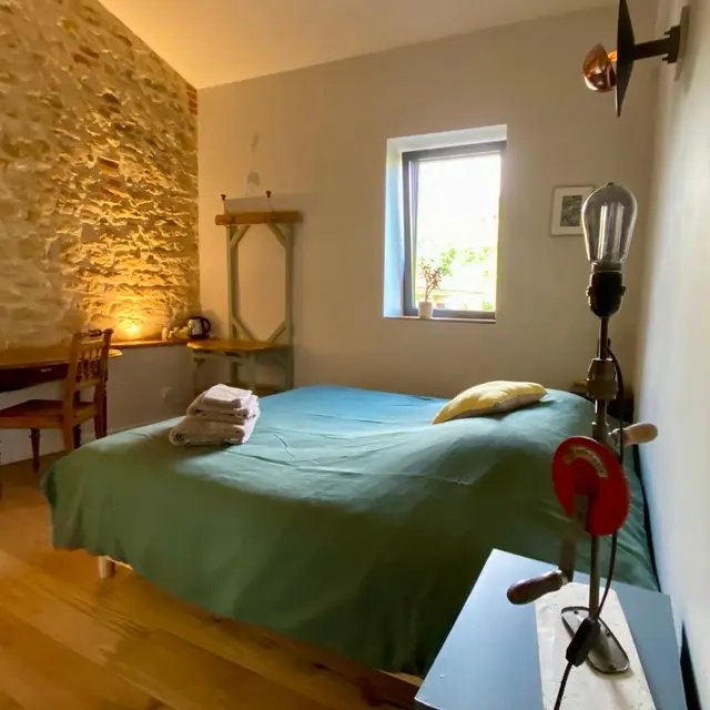 Notre grange d'une surface de 300 m2 offre de beaux volumes, mettant en valeur le charme de l'ancien, tout en offrant un confort moderne. Vous serez séduit par l'atmosphère authentique de cette chambre d'hôte avec son mur en pierre d'origine et une décoration recherchée.