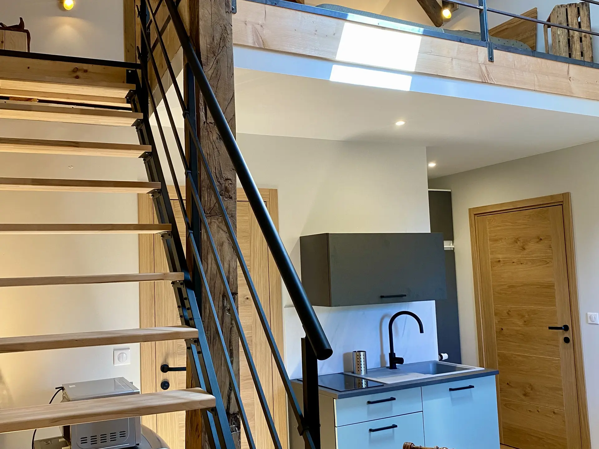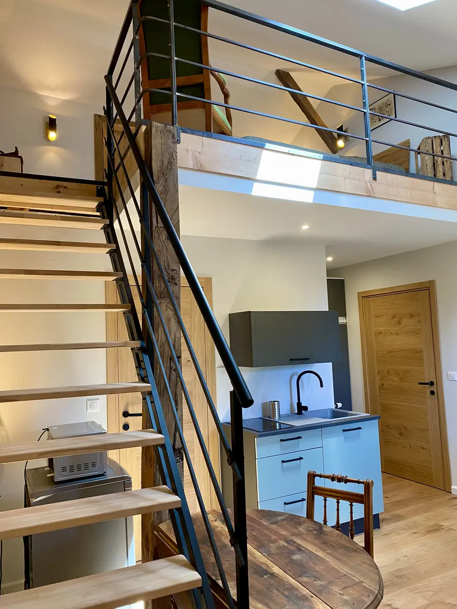 Bienvenue dans votre studio chaleureux, situé au premier étage d’une grange rénovée mêlant authenticité et confort moderne. Vous y accédez par l'escalier principal juste en face de notre porte d'entrée.
