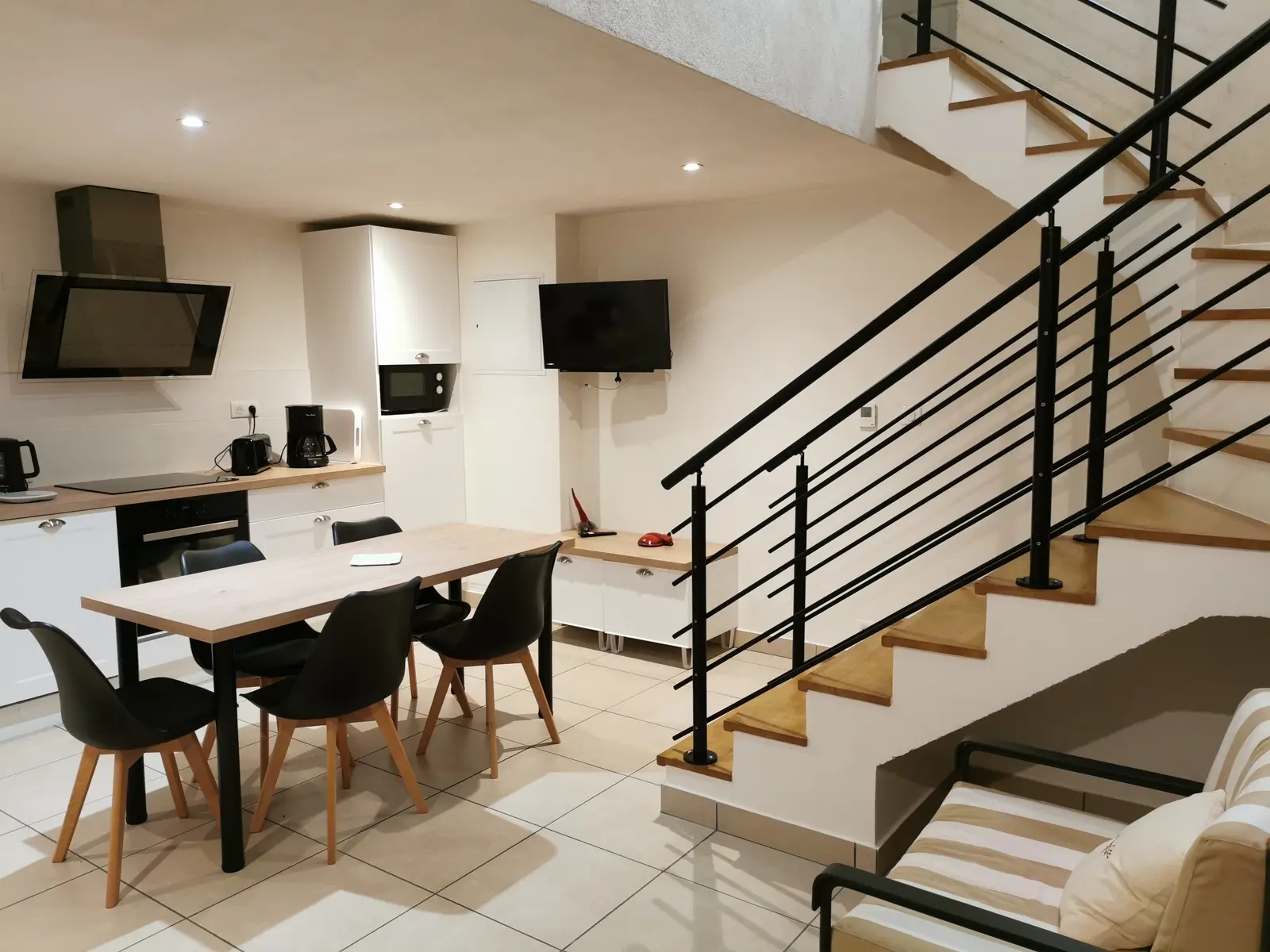 Dans le séjour, vous trouverez tous les équipements pour pouvoir vivre "comme à la maison" : frigo-congélateur, lave linge, lave vaisselle, four, plaque vitro-céramique, hotte, four micro-ondes et même thermomix !!! La TV 32" est connectée. A l'étage, l'une des chambres est équipée d'un lit évolutif pour enfants. La salle de bain (avec wc suspendu) est très spacieuse (2 meubles vasques), la douche XXL. Pour simplifier la vie des voyageurs avec enfants en bas âge, le gite est équipé d'une table à langer avec baignoire intégrée, d'une baignoire bébé à mettre dans la douche, d'une chaise haute, d'un lit parapluie. Enfin, vous trouverez aussi aspirateur balai, fer à repasser avec sa table. Le linge de lit ainsi que le linge de toilette sont fournis.