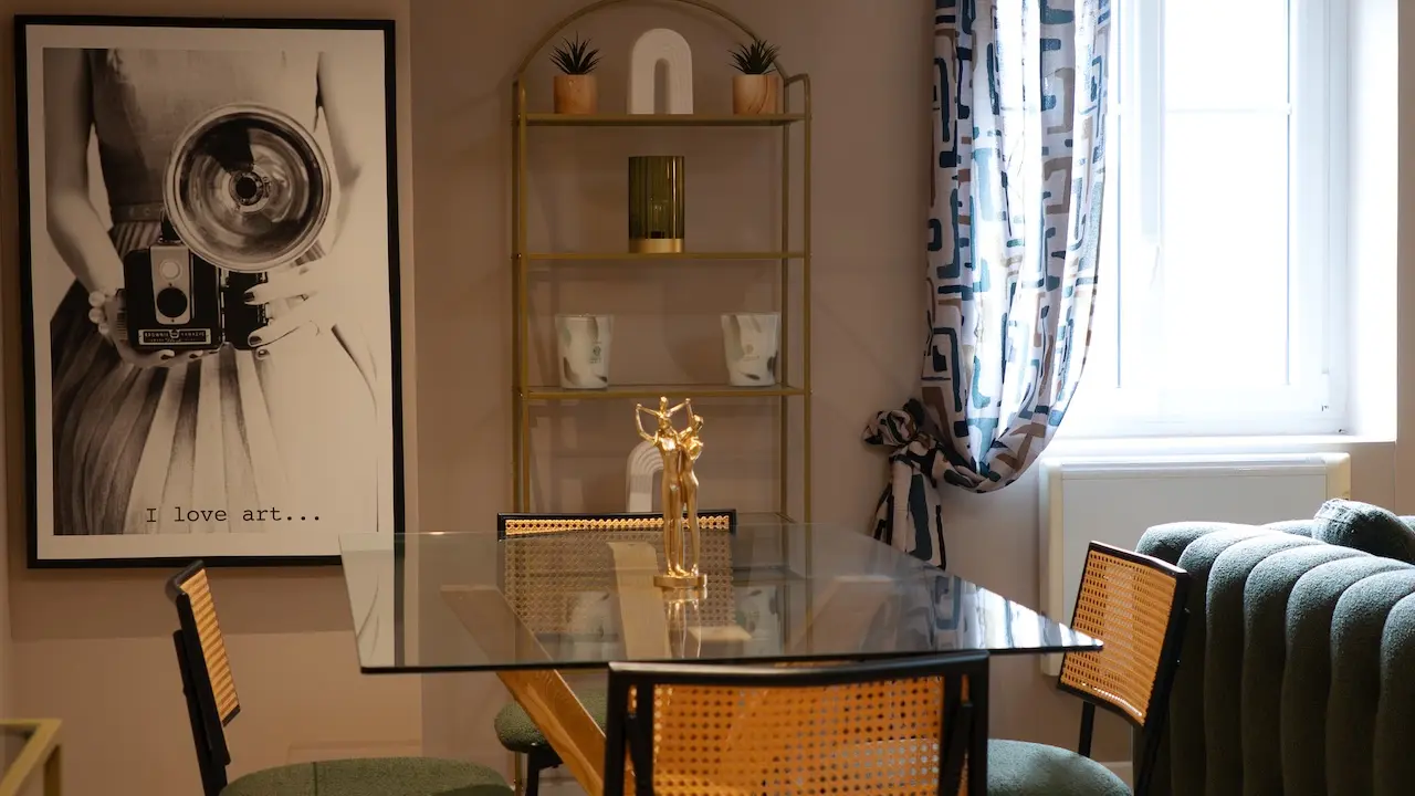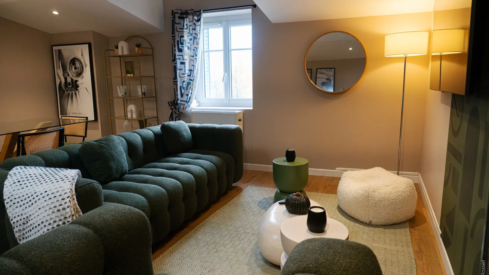 Cet appartement de charme affirmé rend hommage au raffinement du patrimoine local. Pensé pour allier modernité et authenticité, il offre une atmosphère paisible, avec une vue superbe sur le Monastère Royal de Brou.
