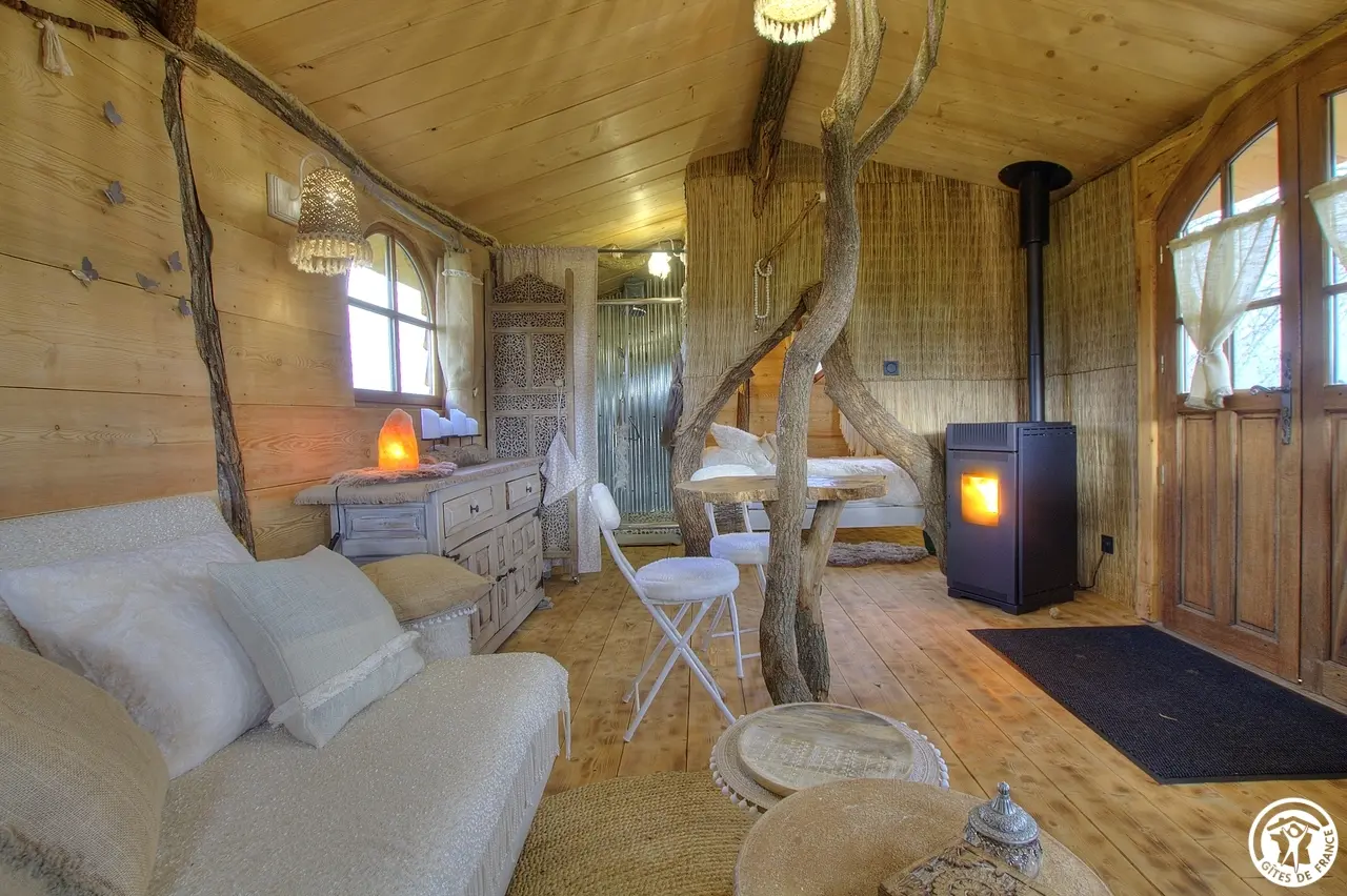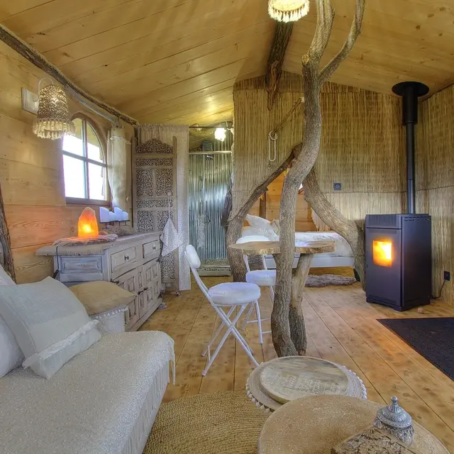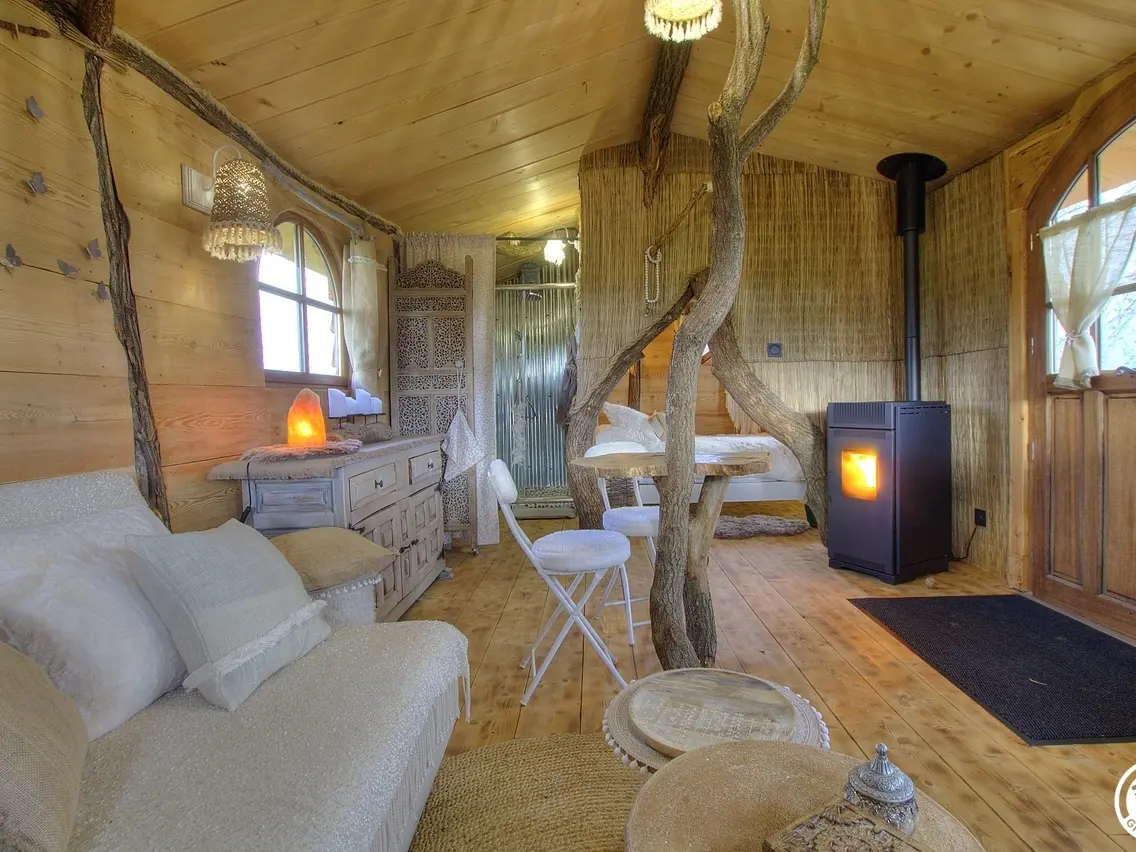 L'atout majeur de la Roucoulotte ? En pleine campagne, parmi les animaux de la ferme mais pas isolée. Présentez vous aux chèvres du coin, leur accueil n'en sera que meilleur. En été, laissez vous bercer par le chant des grenouilles, du paon, ... Pour les amoureux de la farniente, prélassez vous vers le poêle à pellet, lovez vous sur le canapé douillet et profitez du décor. La décoration, totalement conçue par Fanny, ne vous laissera pas de marbre : des troncs d'arbres avec table incrustée, nids d'oiseaux, le tout dans une pièce chaude et conviviale. La chambre est également insolite par son ouverture... Courbez la tête et découvrez cet espace nuit équipé de son lit 140 par 200. Une salle d'eau (avec WC et lavabo) avec grande douche, est dans le prolongement de la pièce principale. Un paravent vous donnera plus d'intimité. Vous souhaitez prolonger le dépaysement ? Il suffit de sortir et de profiter de la terrasse surélevée avec vue sur le petit étang et les champs. L'accès à la roulotte se fait par un escalier atypique, cuisine bien équipée, un espace de vie ouvert sur chambre et sanitaires. Chauffage bois (poêle à granulés). Pour votre confort, les draps, linges de toilette et de maison sont fournis. Lave linge commun et sur demande. Plan d'eau non sécurisé. Départ sentiers pédestres au pied de la roulotte. Parking à 100 m et possibilité de décharger vos bagages en amont. Pas de TV, ni Wifi mais l'assurance d'une déconnexion totale. Climatisation.