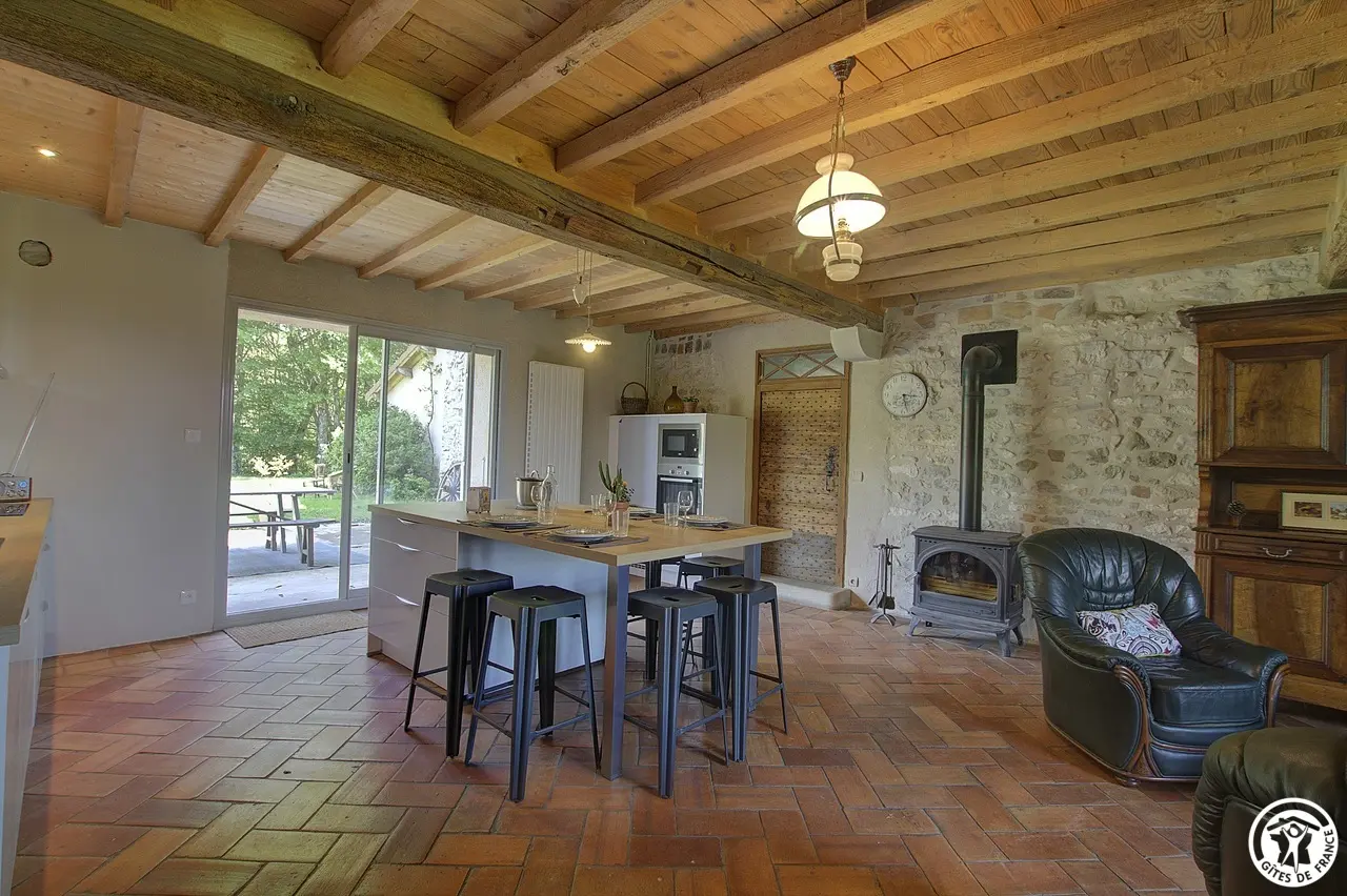 Sur l'extrémité de Meillonnas, cette ancienne ferme a été rénovée pour proposer un gîte de qualité (140 m²) sur deux niveaux avec 4 chambres. Par la cour commune avec les propriétaires, l'entrée indépendante et principale du gîte se fait sur une grand séjour ouvert, avec tommettes au sol et poutres à la française, sur une cuisine équipée et moderne, avec son espace salon. A l'étage supérieur, vous aurez le choix parmi les 4 chambres lumineuses et épurées. Deux chambres avec chacune deux lits simples en 90/190 et deux chambres avec chacune un lit double en 160/200. Une grande salle de bain blanche (7m²) avec lavabo rétro et WC intégré. Depuis la cuisine, vous accédez sur une grande terrasse privative orientée plein Est de 52 m² avec jardin commun. Chauffage fioul et bois (la première malle gratuite et 10 € la suivante). Le plus de ce gîte : les lits sont faits à l'arrivée et charges comprises. espace vert et bois. A découvrir : la manufacture et faïences de Meillonnas, Treffort le village médiéval perché , la vallée du Suran, la voie romaine et le Monastère Royal de Brou.
