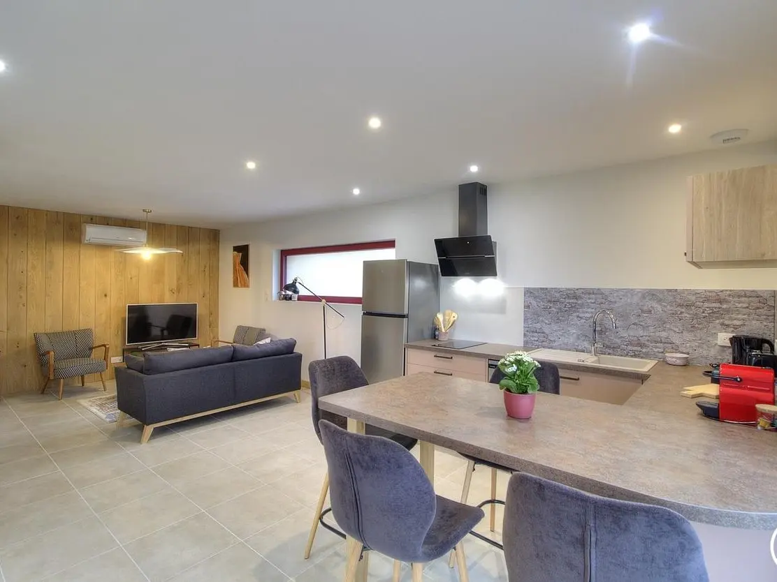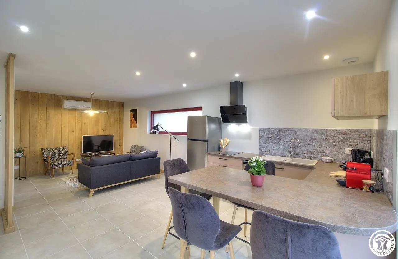 Le gîte, totalement rénové, combine charme et modernité avec ses poutres apparentes, une décoration tendance et ces espaces lumineux créent une ambiance conviviale . À l'étage, deux chambres accueillantes invitent au repos, tandis qu'au rez-de-chaussée, l'espace de vie spacieux et chaleureux est parfait pour partager des moments de détente après une journée bien remplie.