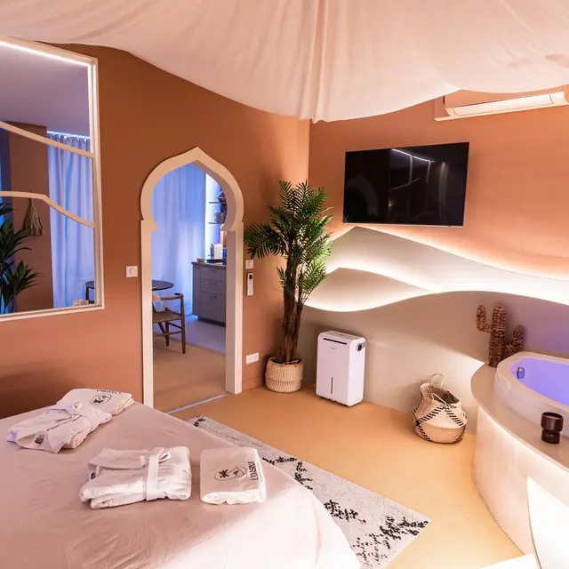 Plongez dans une atmosphère chaleureuse, aux teintes sable et terracotta, mêlant confort moderne et inspiration orientale.