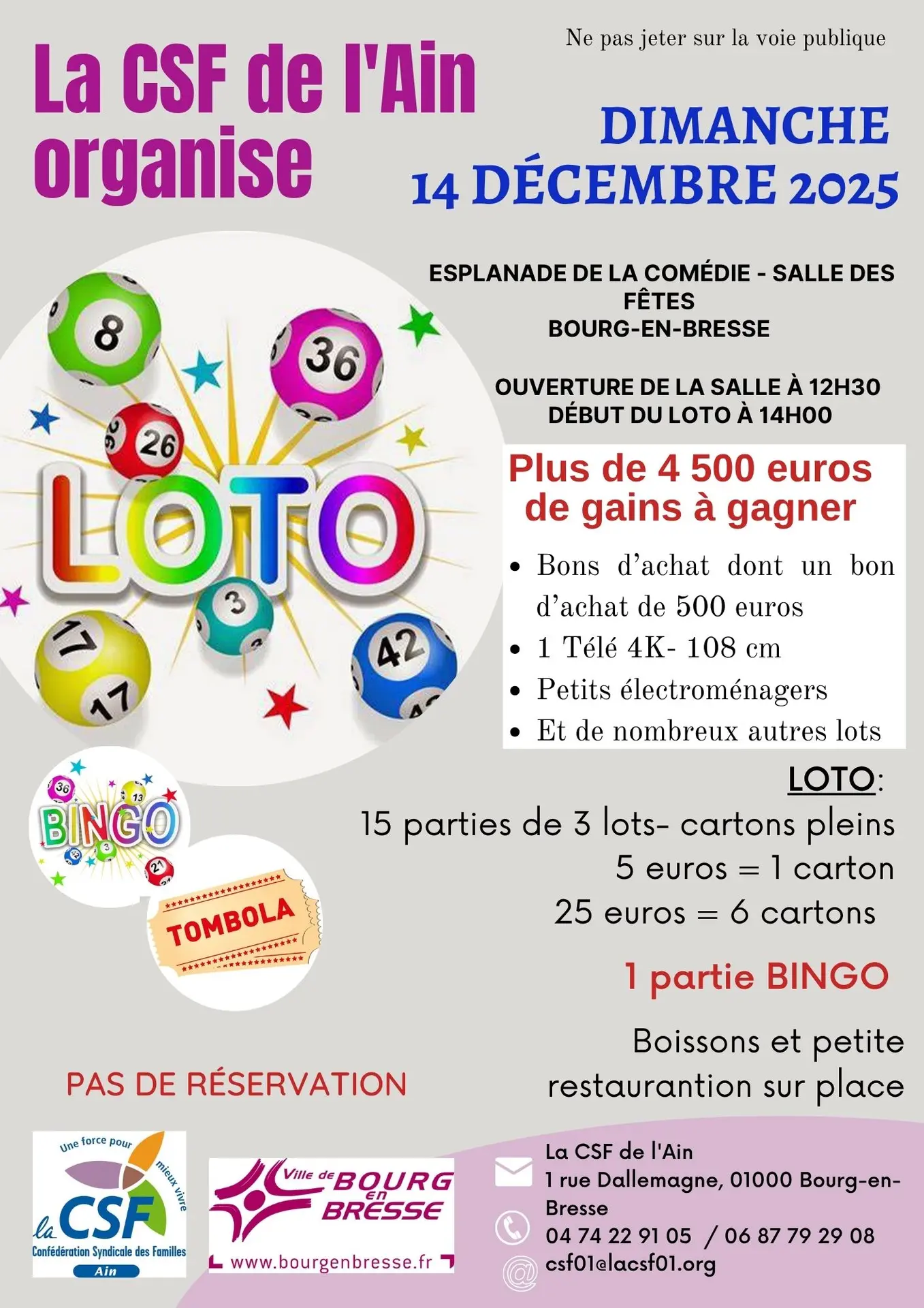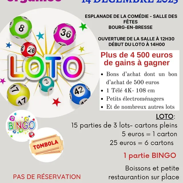 Ouverture de la salle des fêtes à 12h30 - Début du jeu à 14h00
