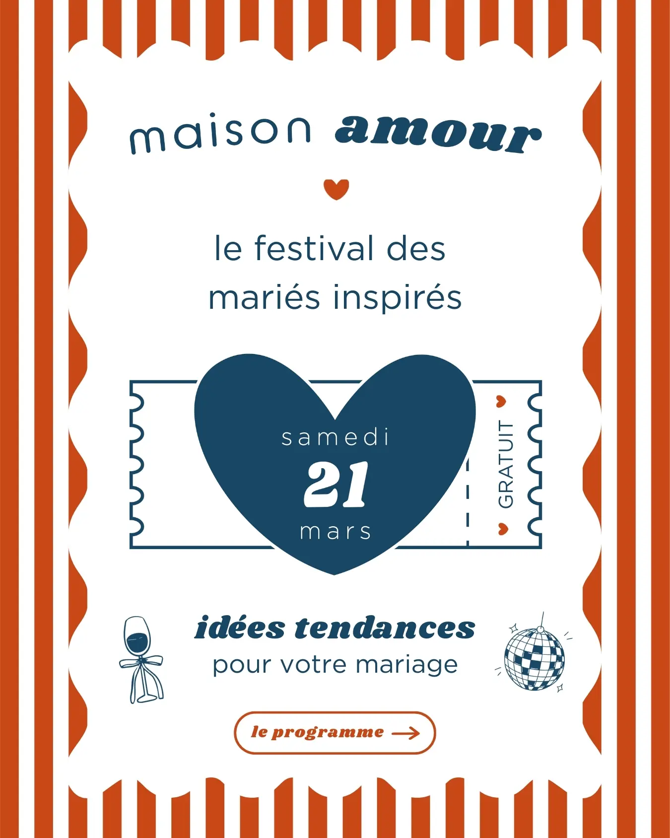 L’idée de ce festival MAISON AMOUR est de proposer un événement ultra moderne, chic et impertinent, afin d’offrir aux futurs mariés une expérience fraîche et différente à Bourg.
