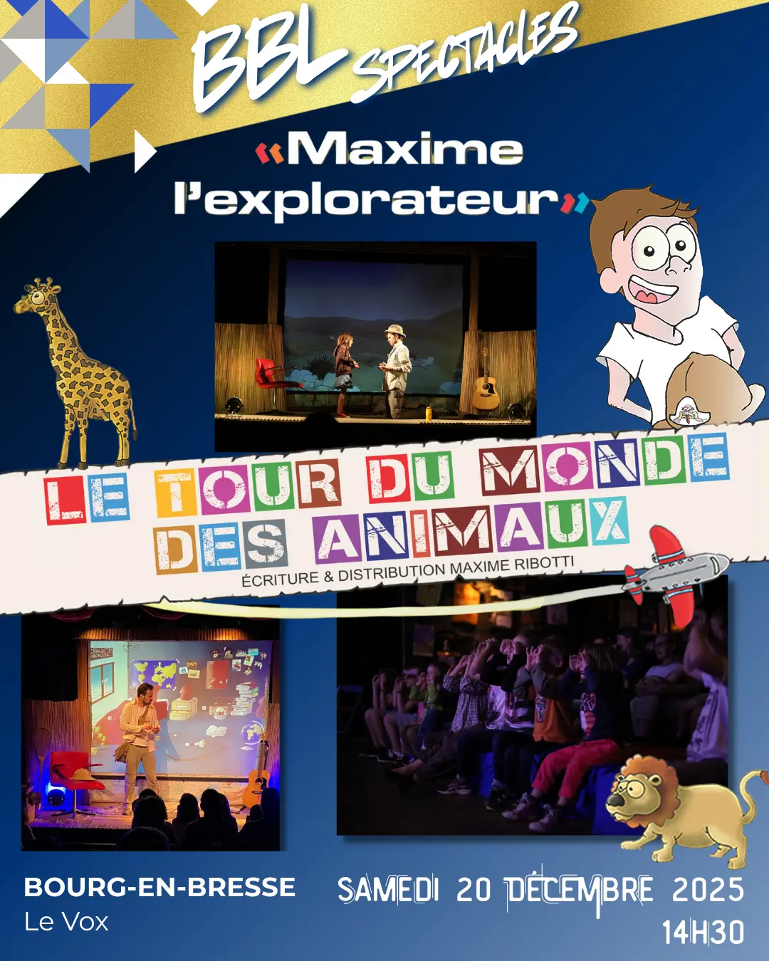 BBL Spectacles vous propose un spectacle pour enfants à partir de 4 ans : "Maxime l'Explorateur - Le tour du monde des animaux".
