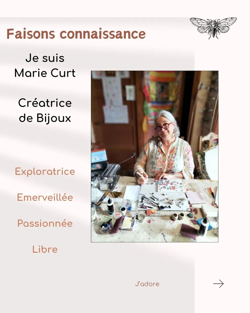 Je m'appelle Marie et je suis une passionnée dans la vie et j'ai soif toujours d'apprendre. Mon univers créatif est très coloré aux accents bohèmes. Ma principale matière de prédilection est l'argile polymère que j'aime allier à d'autres matières. Je pratique la broderie, le crochet et le micro macramé. Les perles utilisées pour ornement de mes pièces sont toujours de bonne qualité (verre, pierre, bois, corne, graine etc.) et choisies avec goût.