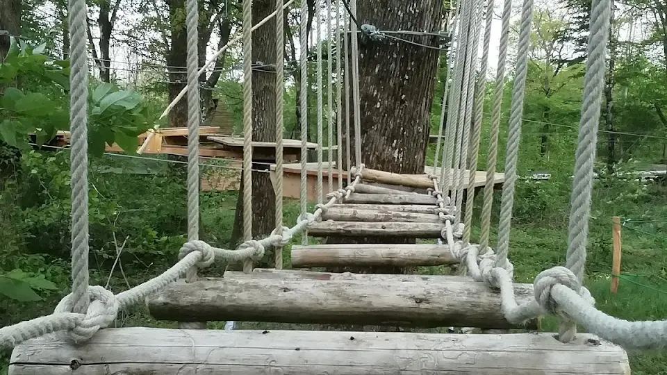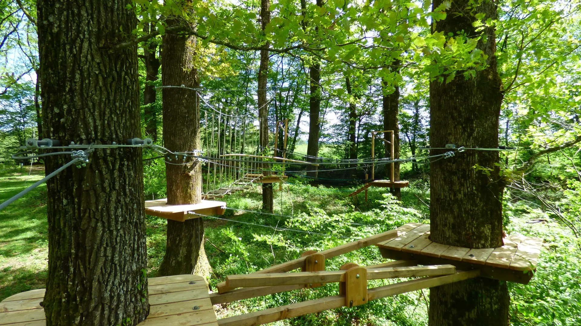 A 10 mn de Bourg-en-Bresse, dans le calme d'un bois de chênes centenaires, 10 parcours et 125 jeux pour passer d'arbre en arbre. Parcours dès 2 ans. 1300 m de tyroliennes pour voler entre les branches... en toute sécurité avec la Ligne de Vie Continue.