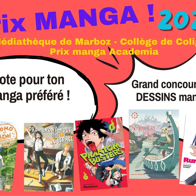 En partenariat avec le collège de Coligny : Venez lire et élire votre manga préféré (5 mangas sélectionnés)Et Participez au grand concours de dessin manga > dépôt des votes et des dessins jusqu’au 5 juin