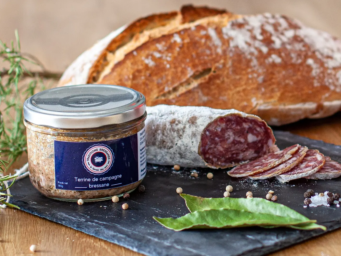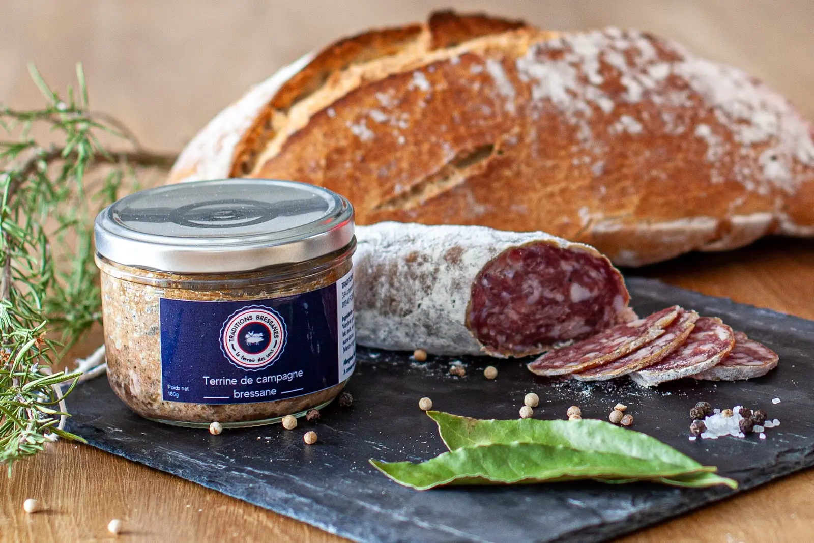 Terrines porc ( campagne , piment de bresse, tomates confites, aux cèpes et vin rouge du bugey, aux olives et rosé du bugey ),terrine volaille vin jaune , rillette au citron vert, terrine de poulet au citron confit