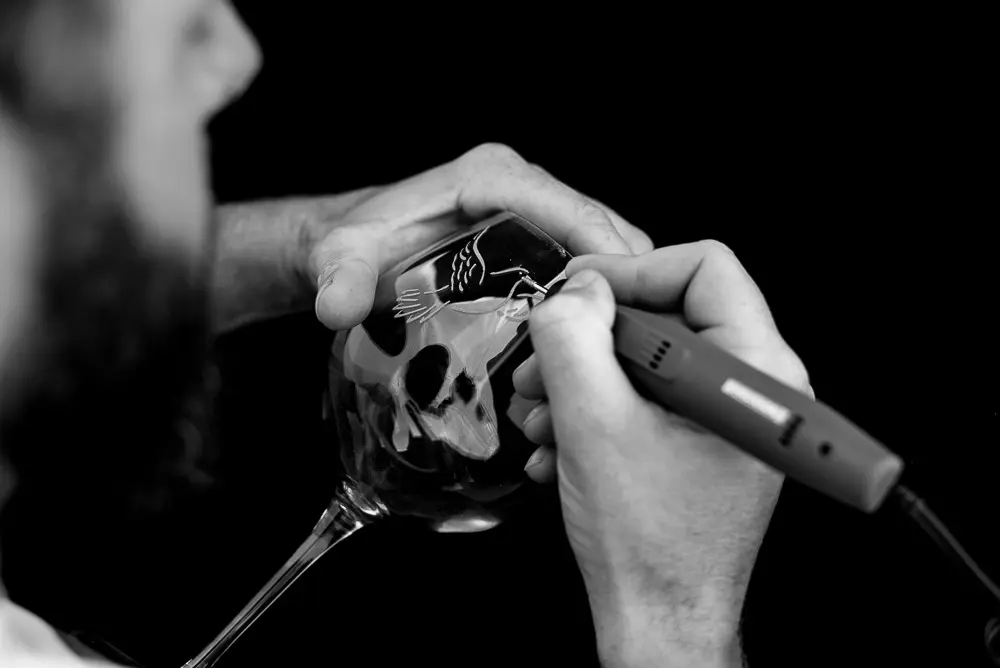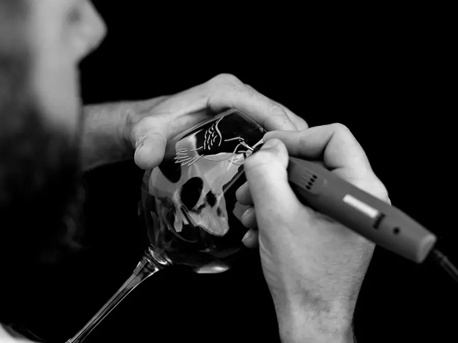 Auto-entrepreneur dans la gravure sur verre depuis 2012, il apprivoise tout en finesse la technique de gravure à la pointe de diamant sur tout support en verre : carafes, verres, bouteilles, vases également trophées en verres.